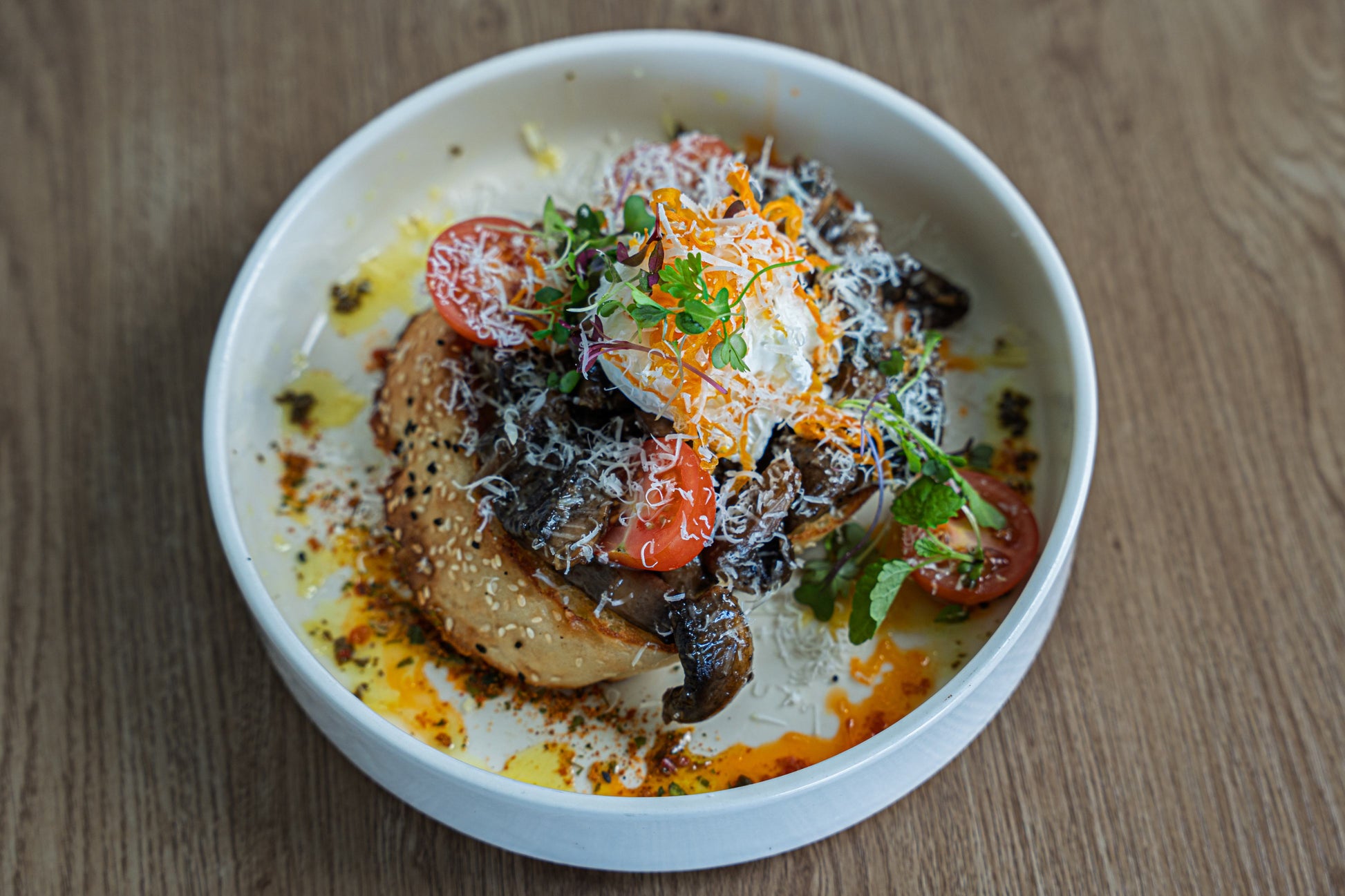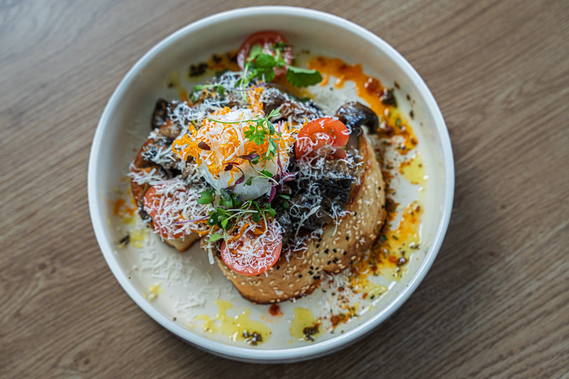 Creamy sautéed mushrooms in a rich truffle oil sauce, served on toast, topped with a poached egg, tomato, parmesan, and a drizzle of truffle oil for an indulgent.